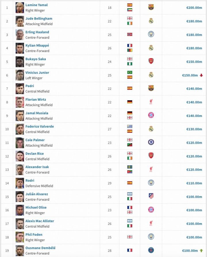 随着登贝莱的市场估值突破1亿欧元大关,德国转会市场最新身价排行榜显示,当前全球范围内已有19位球员的身价达到或超过这一里程碑,值得注意的是,在欧洲五大联赛中,仅有意甲联赛未有球员跻身此列。德甲球员的身价评估将于10月14日迎来新一轮更新,而英超球员的身价调整则定于10月17日进行。