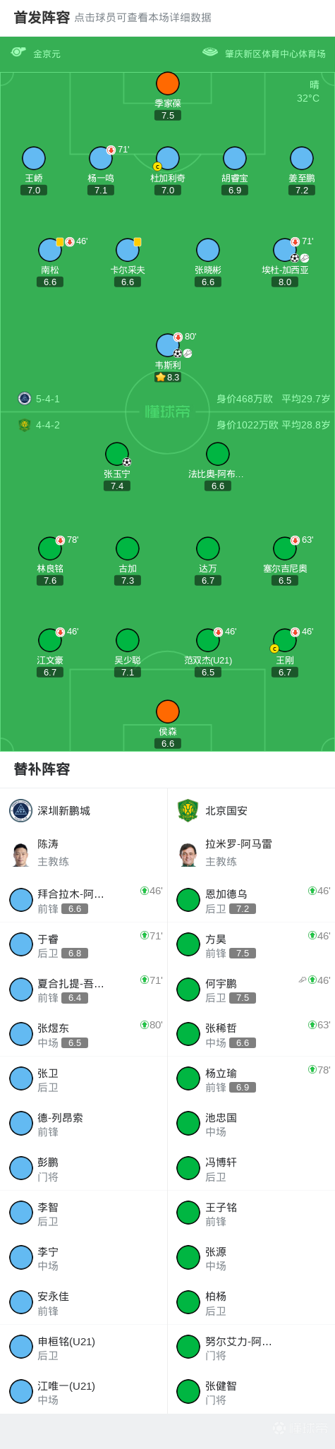 第33分钟,埃杜-加西亚再次展现传球功底,韦斯利门前轻松推射,新鹏城2-0领先国安
